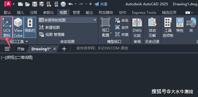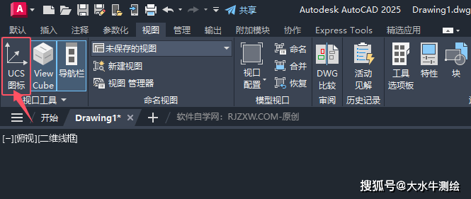 2、点击视图选项卡,找到UCS图标选项。