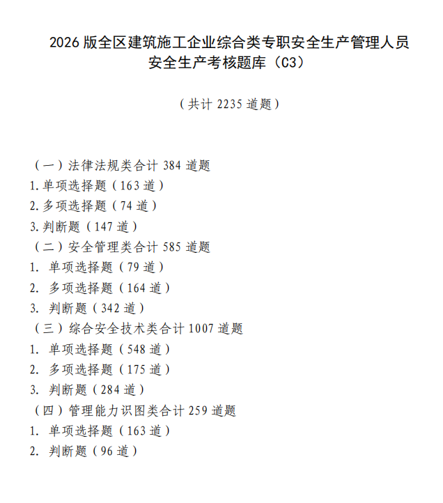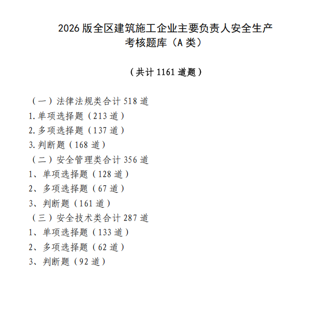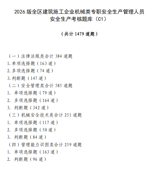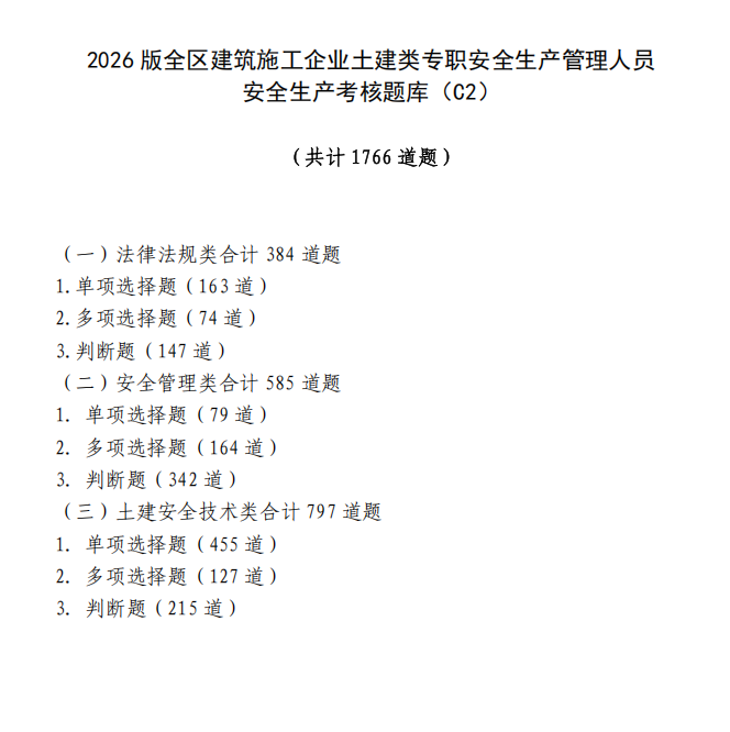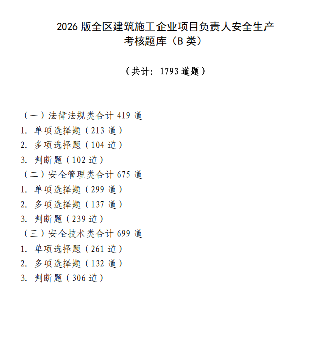 2026版考核题库共计8434道题,其中施工企业主要负责人(A类)试题1161道,项目负责人(B类)试题1793道,机械类专职安全生产管理人员(C1)试题1479道,土建类专职安全生产管理人员(C2)试题1766道,综合类专职安全生产管理人员(C3)试题2235道。