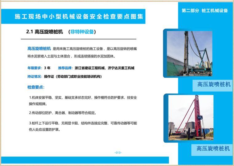 本《图集》共总结了施工现场中小型机械设备 12 类 101 项,包含机械设备简介、年限要求、推荐品牌、持证要求、检查要点等内容。