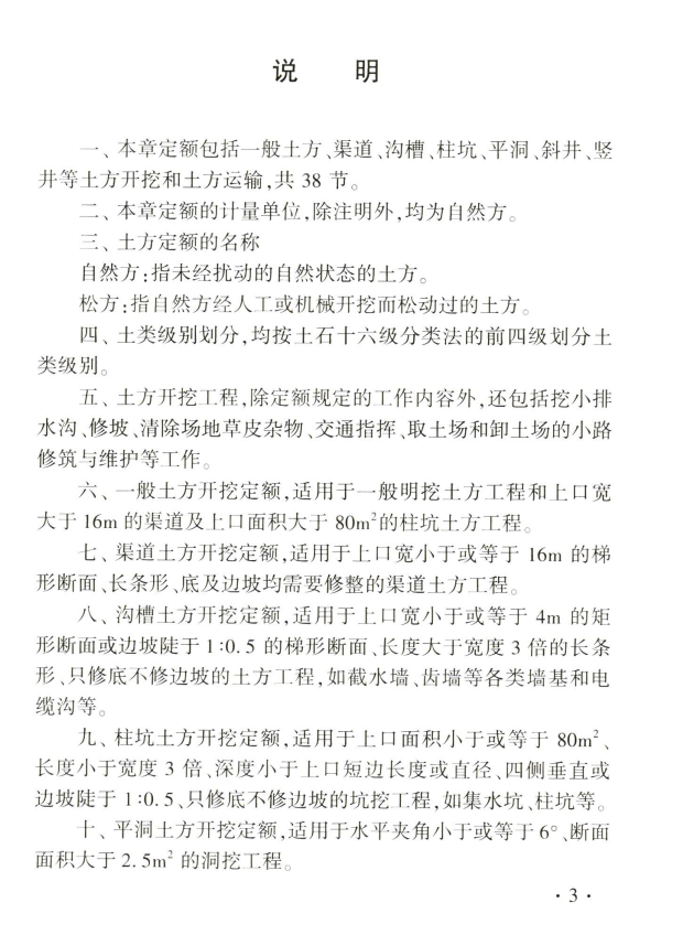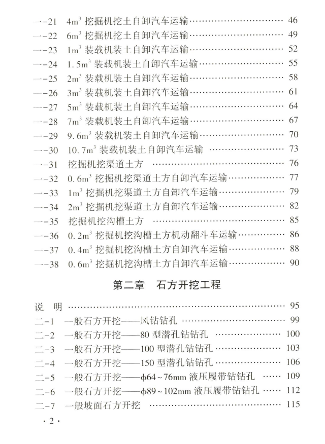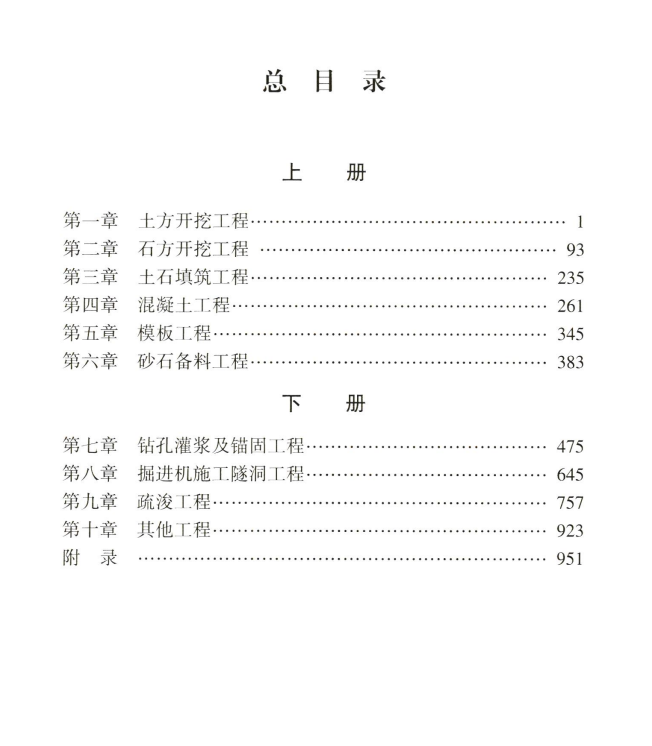 《水利建筑工程概算定额》(简称本定额)包括土方开挖工程、石方开挖工程、土石填筑工程、混凝土工程、模板工程、砂石备料工程、钻孔灌浆及锚固工程、掘进机施工隧洞工程、疏浚工程、其他工程,共十章及附录。