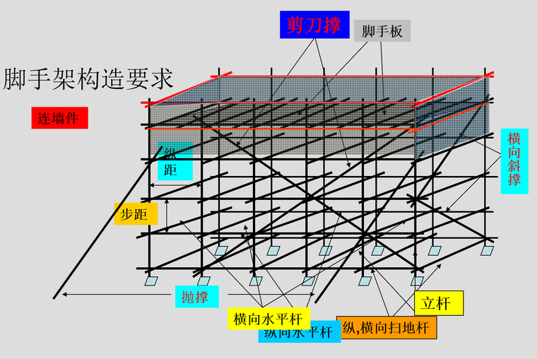 满堂脚手架由立杆、横杆、斜撑、剪刀撑等组成。在设计和施工满堂脚手架时,应合理选用材料、方案和构造措施;其结构应满足强度、稳定性和刚度要求。