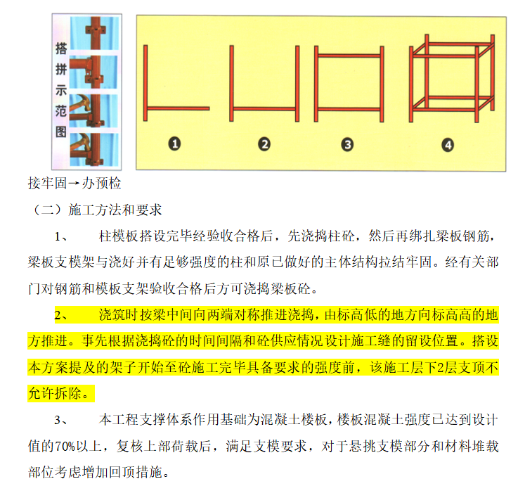 框剪结构,钻孔灌注桩和预应力管桩基础。水平砼构 件支撑高度超过或等于 8m ,或跨度超过 18m ,或施工总荷载大于 15kN/m2 ,或集中线荷载大 于 20kN/m 的模板支撑系统均属高大模板支撑系统,须专门编制施工方案并送专家评审。本工程高大模板采用套扣式钢管架搭设。局部不符合套扣架模数位置,采用扣件式钢管连通。柱混凝土先浇筑,柱砼达到强度间隔3天,采用抱柱保证高大模板架体稳定性在浇筑梁板混凝土。超高超重梁立杆底采用150*150*8钢板做垫板