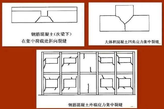 一般多在主体结构建成后出现,混凝土结构应力集中裂缝主要分布在门窗洞口、平面或立面突出凹进以及开结构洞口和结构刚度突变及集中荷载等处。对于预应力钢筋混凝土结构,一般在张拉钢筋锚固端产生的局部压应力集中处产生裂缝。
