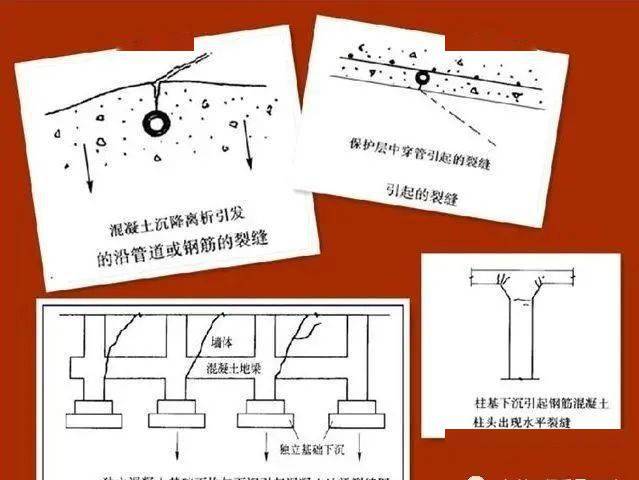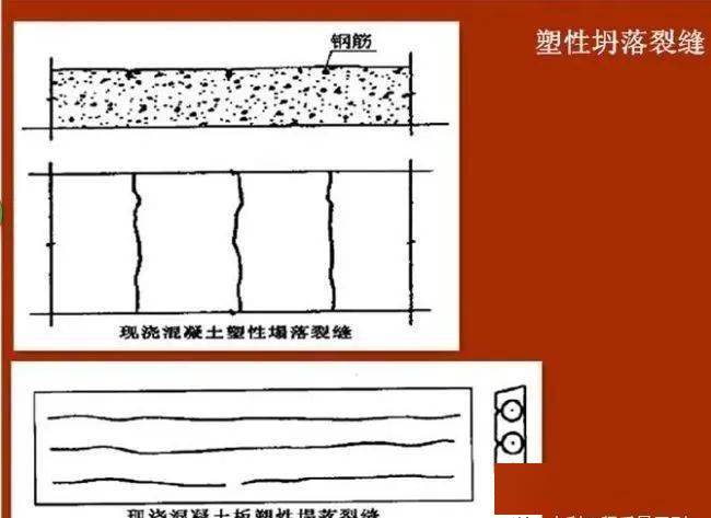 一般多在混凝土浇注过程或浇注成型后,在混凝土初凝前发生,由于混凝土拌合物中的骨料在自重作用下缓慢下沉,水向上浮,即所谓的泌水,若是素混凝土,混凝土内部下沉是均匀的,若是钢筋混凝土,则混凝土沿钢筋下方继续下沉,钢筋上面的混凝土被钢筋支顶,使混凝土沿钢筋表面产生顺筋裂缝。这种塑性塌落裂缝,对于大流动性混凝土或水灰比较大的混凝土尤为严重。