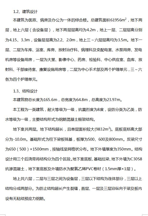 本建筑为医政、病房及办公为一体的综合楼。总建筑面积61956m2,地下两层,地上六层(含设备层),地下两层层高均为4.2m,地上一层、二层层高分别为4.15、3.3m,设备层层高为2.2、2.0m,地上三~六层层高均为3.5m。地下一层、二层为车库、浴室、库房、放射治疗科、病理科及变配电室、水泵用房、发电机房等设备用房,一层为大堂、影像中心、药房、检验科、中心供应室、血库、放射科、干部接待室、康复设施用房等,二层为中心手术部及两个护理单元,三~六各为四个护理单元。