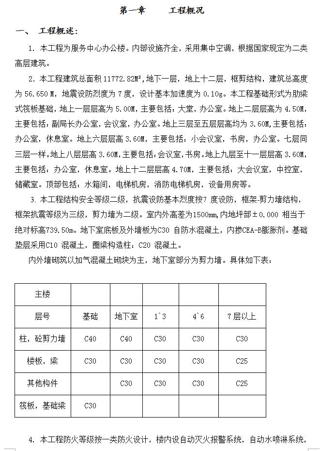 2.本工程建筑总面积11772.82M2,地下一层,地上十二层,框剪结构,建筑总高度为56.650 M,地震设防烈度为7度,设计基本加速度为0.10g。本工程基础形式为肋梁式筏板基础,地上一层层高为5.00M,主要包括:大堂,办公室。地上二层层高为4.50M,主要包括:副局长办公室,会议室,办公室。地上三层至五层层高均为3.60M,主要包括:办公室,休息室。地上六层层高3.60M,主要包括:小会议室,书房,办公室。七层同三层一样。地上八层层高3.60M,主要包括:会议室,书房。地上九层至十一层层高3.60M,主要包括:办公室,休息室。地上十二层层高4.70M,主要包括:大会议室,中控室,储藏室。顶部包括:水箱间,电梯机房,消防电梯机房,设备用房等。