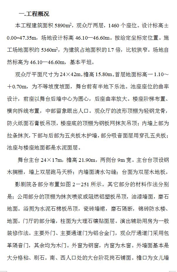 本工程建筑面积5890m2,观众厅两层,1460个座位。设计标高±0.00=47.35m,场地设计标高46.10—46.60m。按给定坐标定位置。施工场地面积约5360m2,为建筑占地面积的l.7倍,比较狭窄。场地自然标高为46.10—46.60m,基本平坦。