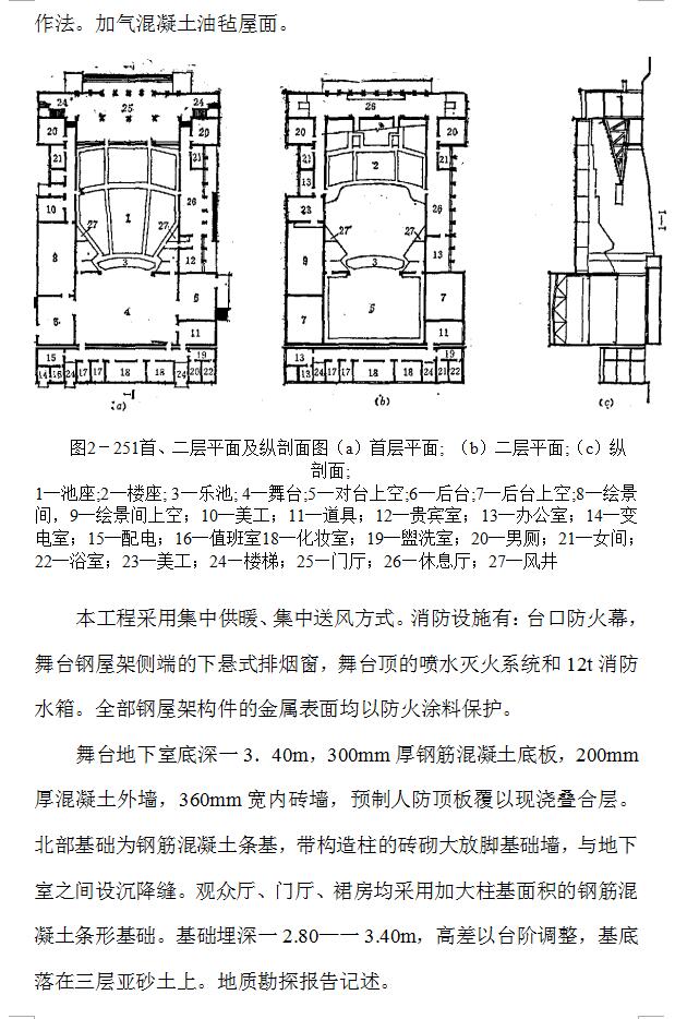 影剧院各部分布置如图2-251所示。其它部分的材料作法分别是;公用部分的顶棚为抹灰喷浆或阻燃铝塑板吊顶,油漆墙面,磨石地面。浴厕为水泥石棉板吊顶,瓷砖墙裙,磨石隔断,锦砖防水楼、地面。门厅的部分墙,柱面为大理石镶贴面层。演出辅助用房为一般装修作法。主要外门、主要通道门为铝合金门,观众厅通道门采用包革隔音门,其余均为木门。外窗为钢窗,内窗为木窗。外墙面基本是大分格粘、刷石。南、西人口处的大台阶花岗石铺面。檐口为女儿墙作法。加气混凝土油毡屋面。