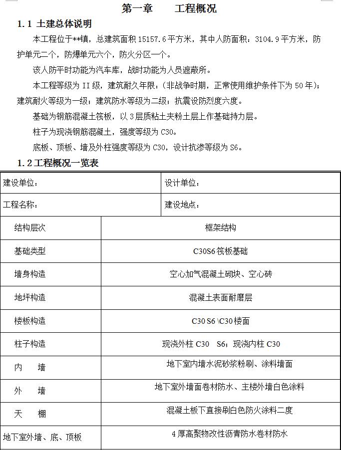 本工程位于**镇,总建筑面积15157.6平方米,其中人防面积:3104.9平方米,防护单元二个,防爆单元六个,防火分区一个。