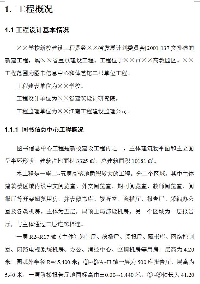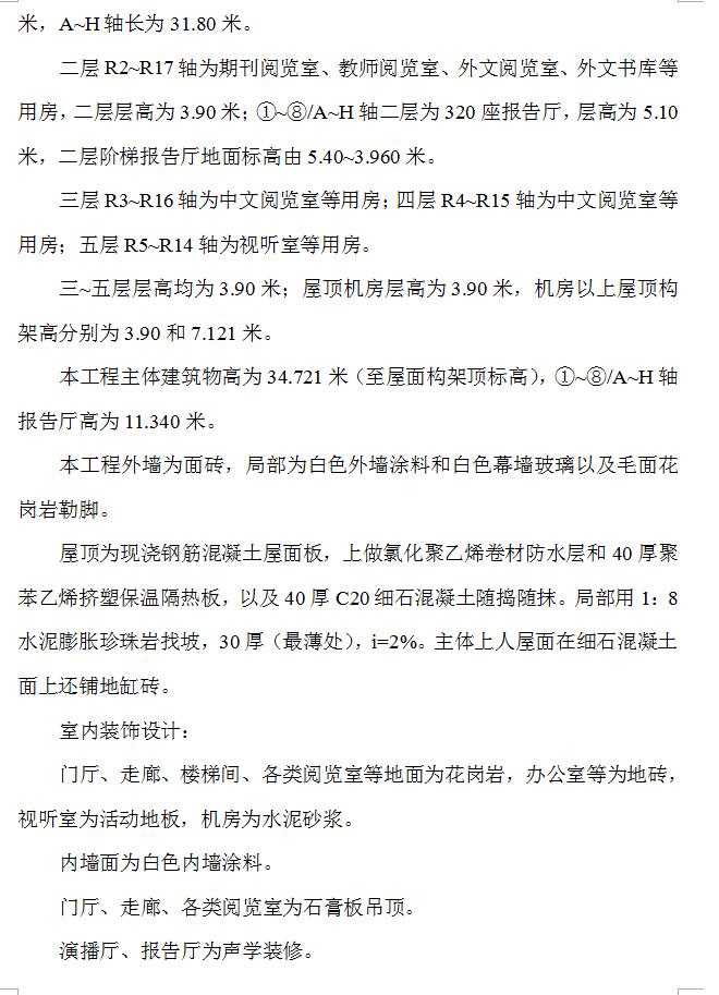 本工程是一座二~五层高落地面积较大的工程。分二个区域,其中主体建筑楼区域内设中文阅览室、外文阅览室、期刊阅览室、教师阅览室、阅报厅等开架阅览用房,并设藏书库、视听室、演播厅、报告厅、采编办公室及各类机房。主体为五层,屋顶上局部设机房。另一个区域为二层报告厅,与主体通过二层连廊相连。