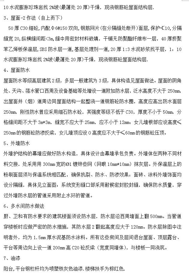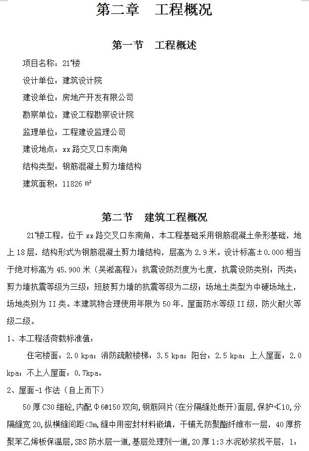本工程基础采用钢筋混凝土条形基础,地上18层,结构形式为钢筋混凝土剪力墙结构,层高为2.9米。设计标高±0.000相当于绝对标高为45.900米(吴淞高程);抗震设防烈度为七度,抗震设防类别:丙类;剪力墙抗震等级为三级;短肢剪力墙的抗震等级为二级;场地土类型为中硬场地土,场地类别为II类。本建筑物合理使用年限为50年,屋面防水等级II级,防火耐火等级二级。