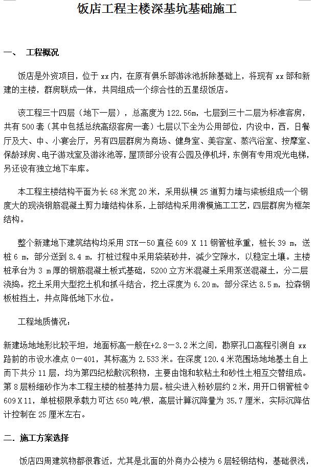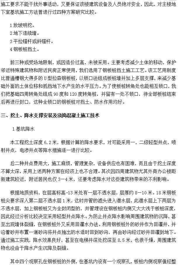 整个新建地下建筑结构均采用STK—50直径609 X 11钢管桩承重,桩长39 m,送桩6 m,部分送到8.4 m,打桩过程中采用袋装砂井,减少空隙水,以稳定土壤。主楼桩承台为3 m厚的钢筋混凝土板式基础,5200立方米混凝土采用泵送混凝土,分二层浇捣。挖土采用大型挖土机和抓斗结合,挖土深度为6.20 m,部分深达8.5 m,拉森钢板桩挡土,井点降低地下水位。