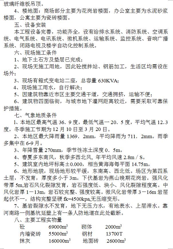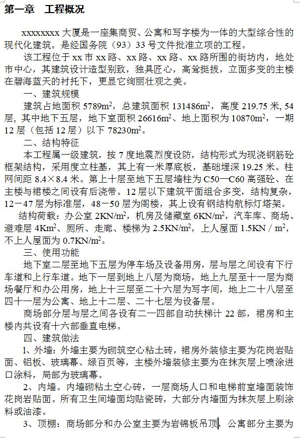本工程属一级建筑,按7度地震烈度设防,结构形式为现浇钢筋砼框架结构,采用度立柱基,其上有一米厚底板,基础埋深19.25米。柱网间距8.4×8.4米。第上十层至地下五层墙柱为C50—C60高强砼、在主楼与裙楼之间设有后浇带。12层以下建筑平面组合多变,结构复杂,12-47层为标准层,48-50层为阁楼,其上设有钢结构航标灯塔架。