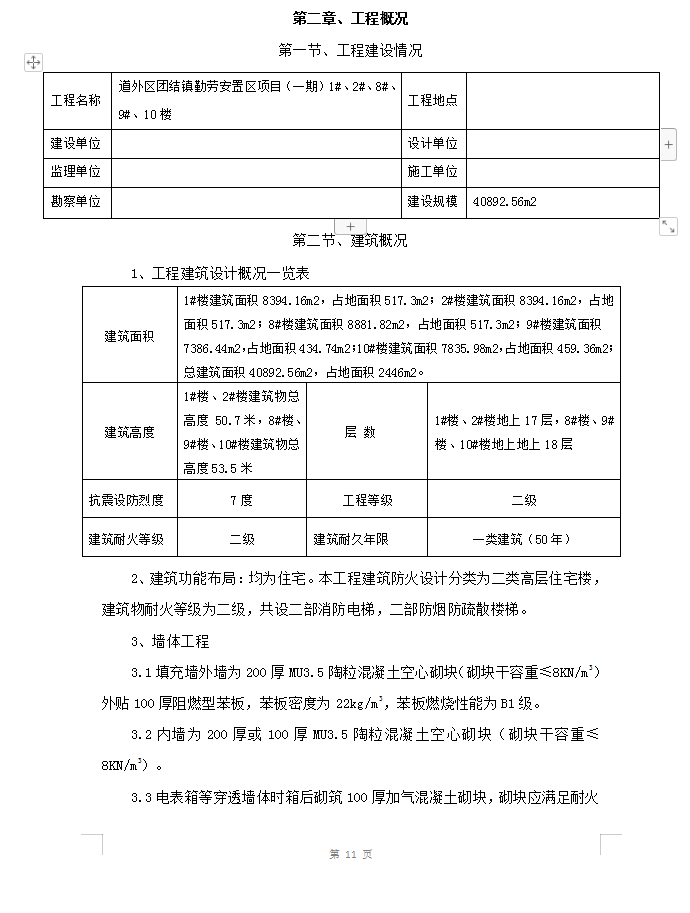 1#楼建筑面积8394.16m2,占地面积517.3m2;2#楼建筑面积8394.16m2,占地面积517.3m2;8#楼建筑面积8881.82m2,占地面积517.3m2;9#楼建筑面积7386.44m2,占地面积434.74m2;10#楼建筑面积7835.98m2,占地面积459.36m2;总建筑面积40892.56m2,占地面积2446m2。建筑功能布局:均为住宅。本工程建筑防火设计分类为二类高层住宅楼,建筑物耐火等级为二级,共设二部消防电梯,二部防烟防疏散楼梯。