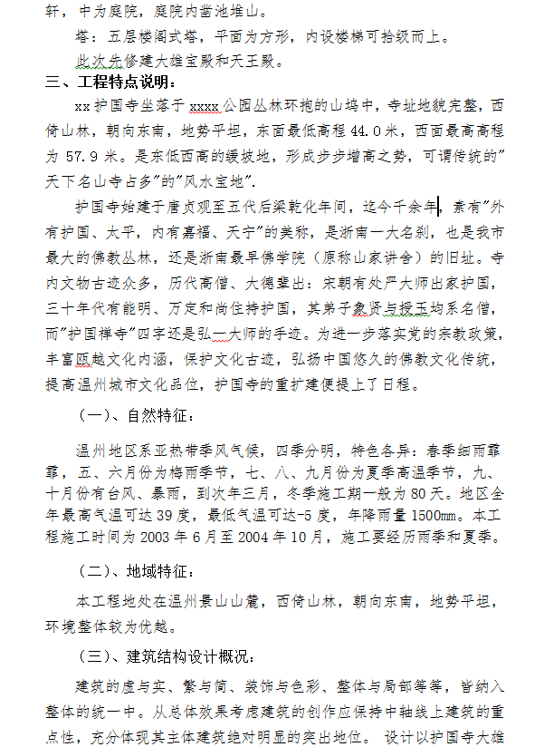 石阙门:整体石制。牌坊:四柱三间冲天式样,钢筋混凝土框架结构。七如来:花岗石七宝塔。中有浮雕,须弥底座。山门:通面阔 15.0米,进深 2.7 米,三间五楼牌楼式建筑,设铺作。钟鼓楼:位于天王殿前,中轴线之东、西两侧。平面呈方形,二层重檐歇山顶。钢筋混凝土框架结构。大雄宝殿:面阔七间31.5,进深五间22.5。其柱网由内外二周组成,形成了面阔五间进深三间的内外槽形式。内槽后部置佛坛,檐柱上设栌斗承七铺作。屋顶采用重檐四阿顶(即庑殿顶),上覆青色陶瓦。藏经楼:位于玉佛殿后,二层建筑歇山重檐顶出平座,七间五进,底层围廊,檐柱上设六铺作重拱。 藏经楼两侧各以廊与厢房相连接。玉佛殿:五间四进,通面阔 16.4米,通进深12.0 米。单檐庑殿顶 。药师殿:通面阔 11.7米,通进深8.4米 ,屋顶悬山式样。法堂:五间三进,通面阔 17.4米,通进深10.8米。单檐歇山顶建筑。厢房:二层双坡顶,前檐廊轩 。方丈院:三合院组合,主体为歇山顶建筑 ,建筑二层。另设廊轩,中为庭院,庭院内凿池堆山。塔:五层楼阁式塔,平面为方形,内设楼梯可拾级而上。此次先修建大雄宝殿和天王殿。