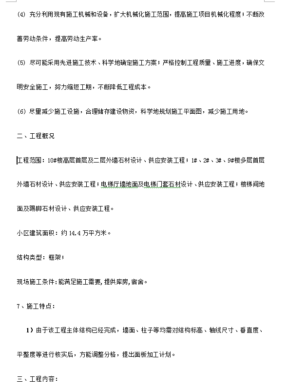 小区建筑面积:约14.4万平方米。结构类型:框架;现场施工条件:能满足施工需要,提供库房,宿舍。