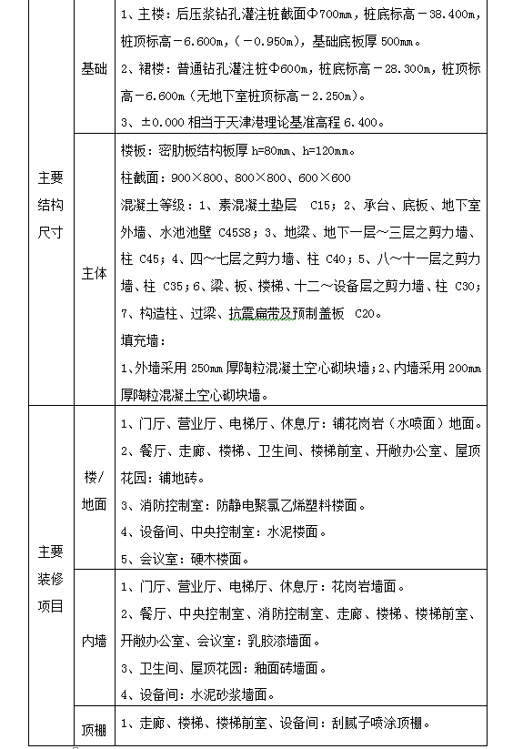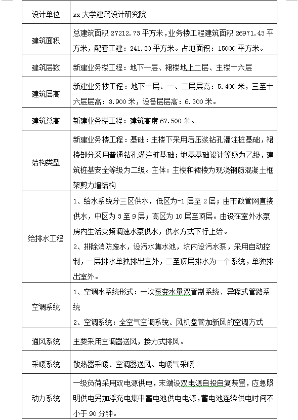 该工程总建筑面积27212.73平方米,业务楼工程建筑面积26971.43平方米,配套工建:241.30平方米。占地面积:15000平方米。建筑层数:新建业务楼工程:地下一层、裙楼地上二层、主楼十六层。建筑层高: 新建业务楼工程:地下一层、一、二层层高:5.400米,三至十六层层高:3.900米。设备层层高:6.300米。建筑总高:新建业务楼工程:建筑高度67.500米。结构类型:新建业务楼工程:基础:主楼下采用后压浆钻孔灌注桩基础,裙楼部分采用普通钻孔灌注桩基础;地基基础设计等级为乙级,建筑桩基安全等级为二级。主体:主楼和裙楼为现浇钢筋混凝土框架剪力墙结构。