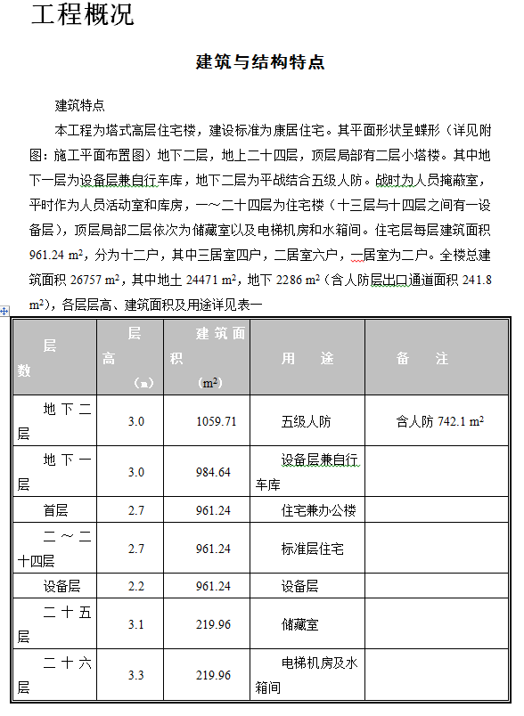 本工程为塔式高层住宅楼,建设标准为XX住宅。其平面形状呈蝶形(详见附图:施工平面布置图)地下二层,地上二十四层,顶层局部有二层小塔楼。其中地下一层为设备层兼自行车库,地下二层为平战结合五级人防。战时为人员掩蔽室,平时作为人员活动室和库房,一~二十四层为住宅楼(十三层与十四层之间有一设备层),顶层局部二层依次为储藏室以及电梯机房和水箱间。住宅层每层建筑面积961.24 m2,分为十二户,其中三居室四户,二居室六户,一居室为二户。全楼总建筑面积26757 m2,其中地土24471 m2,地下2286 m2(含人防层出口通道面积241.8 m2)。