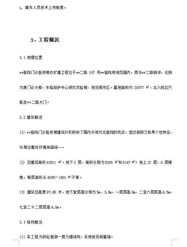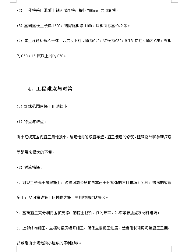 总建筑面积62511 ㎡。地下2 层,面积分别为5285 ㎡和5147㎡;地上22 层,6 层裙楼,每层面积从4055~1801 ㎡不等。建筑总高度97.95 米,地下室层高分别为5m、3.8m,一层层高6m,二至六层层高4.5m,七至二十二层层高4.0m。本工程为钢砼框架—剪力墙结构,采用桩筏板基础。工程桩采用混凝土钻孔灌注桩,桩径700mm,共559 根。基础底板主楼厚1600,裙房底板厚1100,底板面标高-9.2米。本工程砼标号不一样,八层以下柱、墙为C40,梁板为C30,9~13 层柱、墙为C35,梁板为C30。13 层以上均为C30。