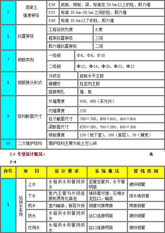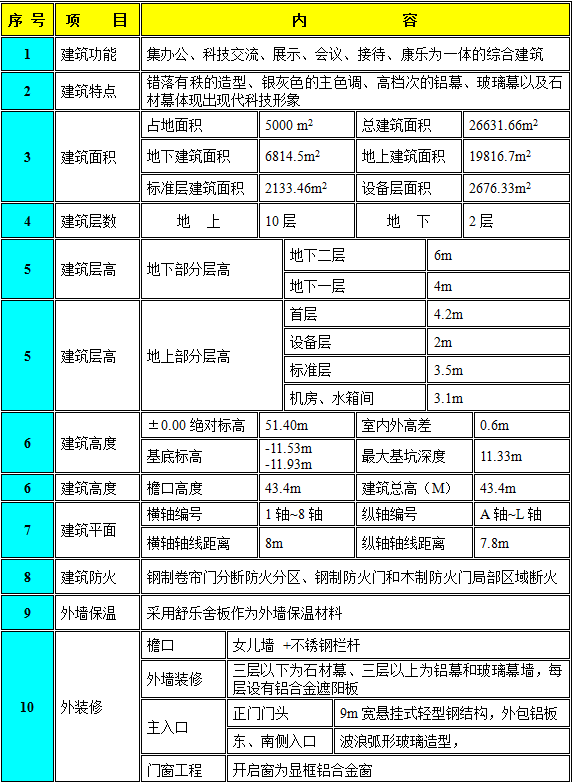 占地面积为5000 m2,总建筑面积为26631.66m2,地下建筑面积为6814.5m2,地上建筑面积为19816.7m2,标准层建筑面积 2133.46m2,设备层面积2676.33m2,地上10层,地下2层,地下二层6m,地下一层4m,首层4.2m,设备层2m,标准层3.5m,机房、水箱间 3.1m。建筑标高:±0.00绝对标高51.40m,室内外高差0.6m,基底标高 -11.53m,-11.93m,最大基坑深度11.33m。檐口高度43.4m,建筑总高43.4m。横轴编号:1轴~8轴,纵轴编号:A轴~L轴,横轴轴线距离:8m,纵轴轴线距离7.8m。