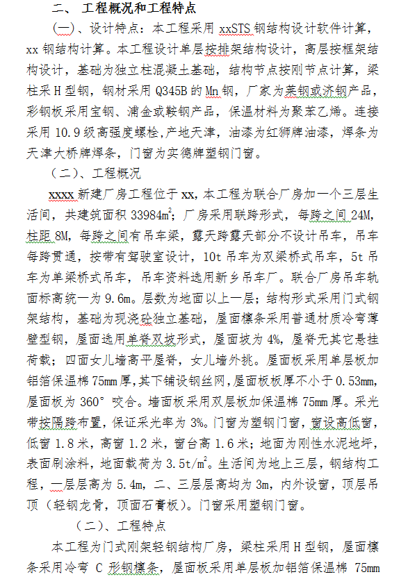本工程为联合厂房加一个三层生活间,共建筑面积33984m2;厂房采用联跨形式,每跨之间24M,柱距8M,每跨之间有吊车梁,露天跨露天部分不设计吊车,吊车每跨贯通,按带有驾驶室设计,10t吊车为双梁桥式吊车,5t吊车为单梁桥式吊车,吊车资料选用新乡吊车厂。联合厂房吊车轨面标高统一为9.6m。层数为地面以上一层;结构形式采用门式钢架结构,基础为现浇砼独立基础,屋面檩条采用普通材质冷弯薄壁型钢,屋面选用单脊双坡形式,屋面坡为4%,屋脊无其它悬挂荷载