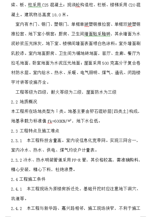 住宅楼为六层带半地下室砖混结构;建筑面积11533.72平方米;基础为条型基础;抗震设防烈度为“七”度;住宅层高为3.0米,顶层高为3.3米,半地下室层高2.5米;—0.60以下采用MU10机制红砖,M10水泥砂浆砌筑;—0.60以上采用MU10机制红砖,M10混合砂浆砌筑;钢筋为Ⅰ、Ⅱ级钢;现浇砼梁、板、柱采用C20混凝土;条形基础砼采用C15素混凝土。建筑物总高度20.9米。