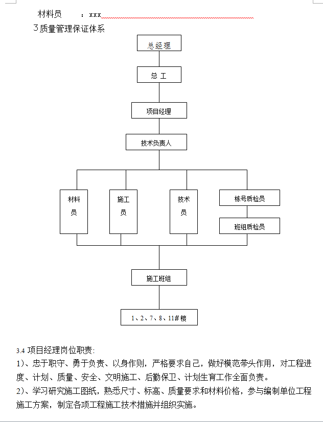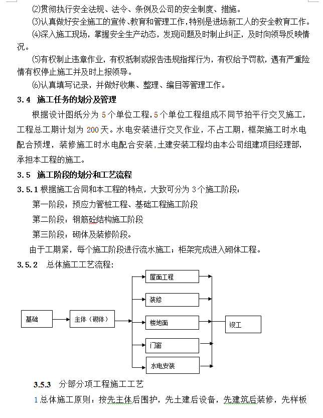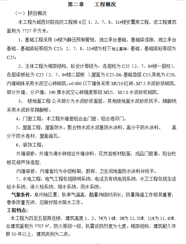 本工程为XX路拓改工程XX区1、2、7、8、11#楼安置房工程,该工程建筑面积为7757平方米。1、基础工程采用1#楼为静压预制管桩,独立承台基础,基础梁连接,独立承台基础、基础梁砼等级为C25;2、7、8、11#楼为柱下独立基础,基础、基础梁砼等级为C25;2、主体工程为框架结构,砼设计等级为:各层柱为C25(2、7、8#楼一层柱),各层梁板砼为C25(2、7、8#楼二层板 );屋面为C25、S6,基础垫层C15,其他为C20, 内墙砌体采用水泥空心砖砌筑,±0.000以下墙体采用MU10红砖、M7.5水泥砂浆砌筑,部分外墙、分户墙:190厚水泥空心砖强度等级MU5.M 5.0水泥砂浆砌筑,3、 楼地面工程:公共部分为水泥砂浆面层。其他楼地面水泥砂浆找平,踢脚线采用水泥砂浆踢脚板。4、门窗工程:本工程外墙窗铝合金门窗、铝合卷帘门。5、屋面工程:屋面防水:聚合物水泥水泥基防水涂料、高分子防水涂料、高分子防水卷材,屋面曲瓦。6、装饰工程:外墙装修:外墙为清水砖结合外墙涂料、花岗岩板材贴面,成品门窗套、阳台栏板花胡芦饰造型; 内墙装修:内墙面均为中级粉刷,厨房、卫生间地面防水涂料并找平。7、水电工程:电气工程包括照明系统、电话及有线电视系统,水卫工程包括生活给水系统、消火栓系统、排水系统、雨水系统。