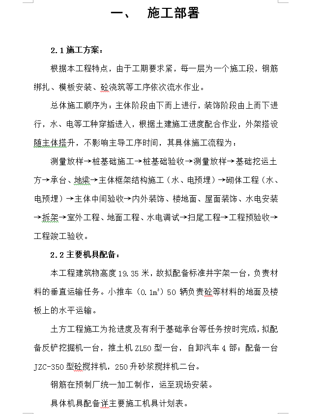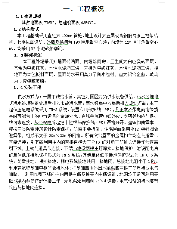 其占地面积796M2,总建筑面积4384M2。本工程基础采用直径为400mm管桩,地上设计为五层现浇钢筋混凝土框架结构,七度抗震设防,外墙及梯间为190厚承重空心砖。内墙为120厚非承重空心砖,均采用M5水泥砂浆砌筑。总体施工顺序为:主体阶段由下而上进行,装饰阶段由上而下进行,水、电等工种穿插进入,根据土建施工进度配合作业,外架搭设随主体搭升,不影响主导工序时间,其具体施工流程为:测量放样→桩基础施工→桩基础验收→测量放样→基础挖运土方→承台、地梁→主体框架结构施工(水、电预埋)→砌体工程(水、电预埋)→主体中间验收→内外装饰、楼地面、屋面装饰、水电安装→拆架→室外工程、地面工程、水电调试→扫尾工程→工程预验收→工程竣工验收。