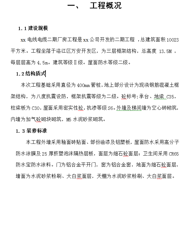 总建筑面积10023平方米。为三层框架结构,总高度13.5M ,每层层高为4.5m。建筑等级Ⅱ级。屋面防水等级二级。 本次工程基础采用直径为400mm管桩,地上部分设计为现浇钢筋混凝土框架结构,为八度抗震设防,框架抗震等级为二级。砼标号:承台、地梁C35,柱梁板为C30,屋面采用密实性砼,抗渗等级S6。外墙及梯间墙为空心砖砌筑,内墙为加气砼砌块砌筑,M5水泥砂浆砌筑。