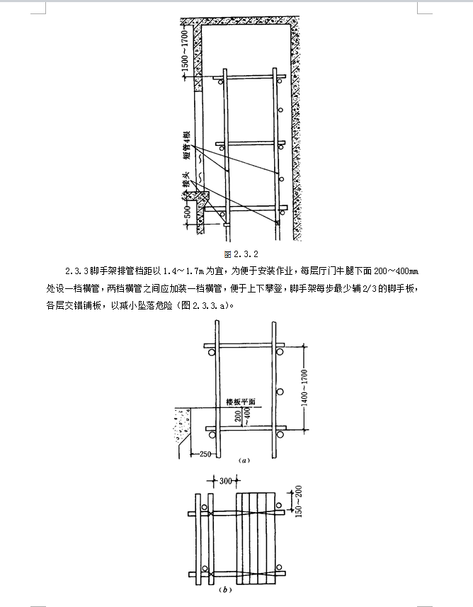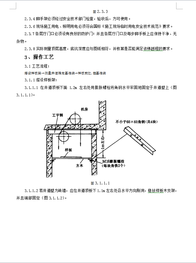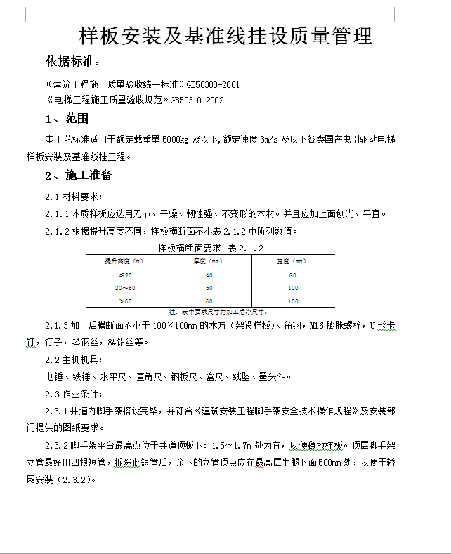 此文件为电梯工程质量管理,包括样板安装及基准线挂设质量管理、井道机械设备安装质量管理、钢丝绳安装质量管理等,供大家参考。作业条件:1、井道内脚手架搭设完毕,并符合《建筑安装工程脚手架安全技术操作规程》及安装部门提供的图纸要求。2、脚手架平台最高点位于井道顶板下:1.5~1.7m处为宜,以便稳放样板。顶层脚手架立管最好用四根短管,拆除此短管后,余下的立管顶点应在最高层牛腿下面500mm处,以便于轿厢安装。3、脚手架排管档距以1.4~1.7m为宜,为便于安装作业,每层厅门牛腿下面200~400mm处设一档横管,两档横管之间应加装一档横管,便于上下攀登,脚手架每步最少辅2/3的脚手板,各层交错铺板,以减小坠落危险