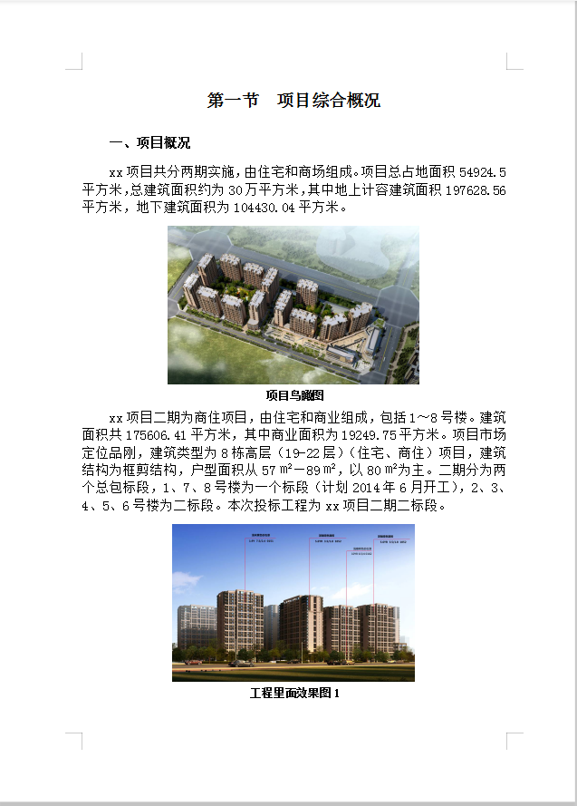 xx项目共分两期实施,由住宅和商场组成。项目总占地面积54924.5平方米,总建筑面积约为30万平方米,其中地上计容建筑面积197628.56平方米,地下建筑面积为104430.04平方米。xx项目二期为商住项目,由住宅和商业组成,包括1~8号楼。建筑面积共175606.41平方米,其中商业面积为19249.75平方米。项目市场定位品刚,建筑类型为8栋高层(19-22层)(住宅、商住)项目,建筑结构为框剪结构,户型面积从57㎡—89㎡,以80㎡为主。二期分为两个总包标段,1、7、8号楼为一个标段(计划2014年6月开工),2、3、4、5、6号楼为二标段。本次投标工程为xx项目二期二标段。
