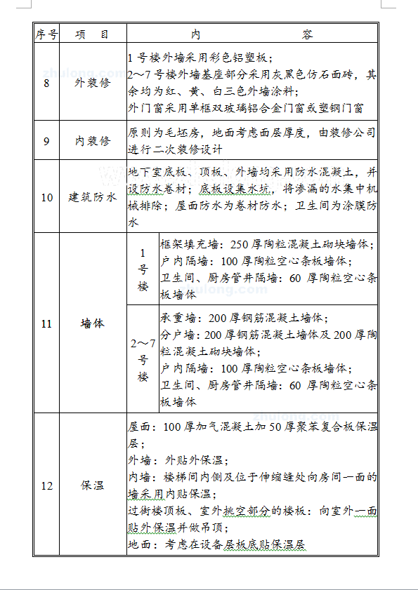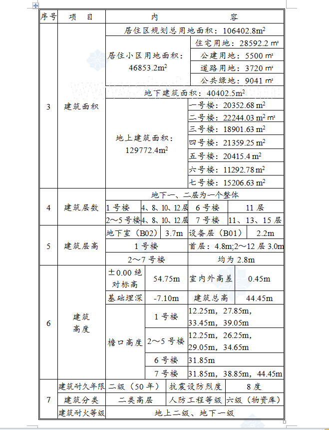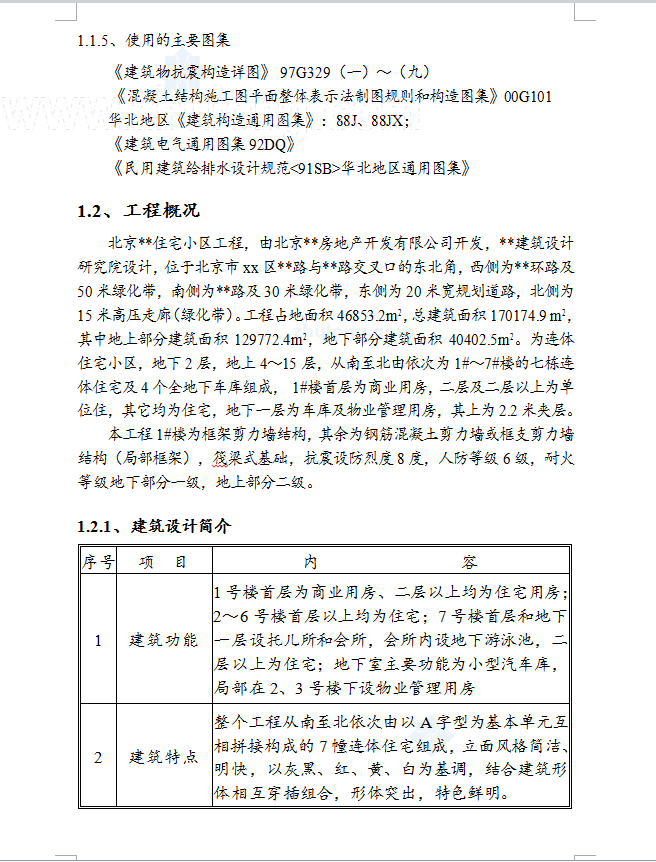 工程占地面积46853.2m2,总建筑面积170174.9 m2,其中地上部分建筑面积129772.4m2,地下部分建筑面积40402.5m2。为连体住宅小区,地下2层,地上4~15层,从南至北由依次为1#~7#楼的七栋连体住宅及4个全地下车库组成, 1#楼首层为商业用房,二层及二层以上为单位住,其它均为住宅,地下一层为车库及物业管理用房,其上为2.2米夹层。本工程1#楼为框架剪力墙结构,其余为钢筋混凝土剪力墙或框支剪力墙结构(局部框架),筏梁式基础,抗震设防烈度8度,人防等级6级,耐火等级地下部分一级,地上部分二级。