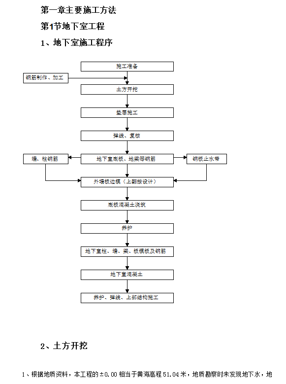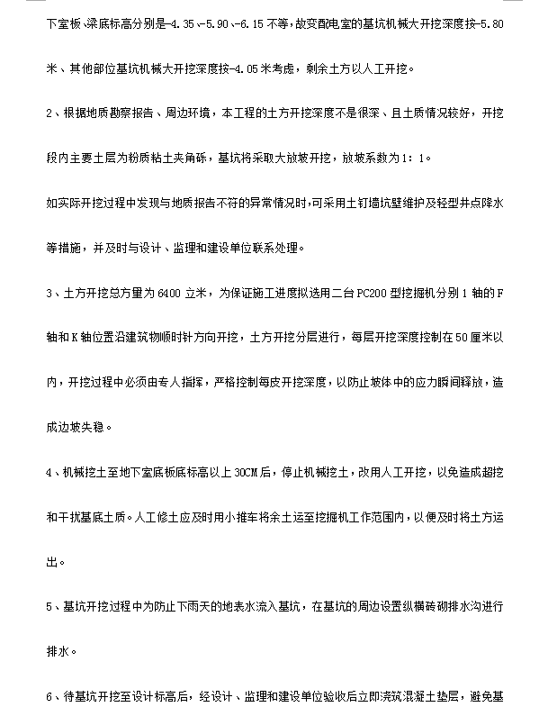 1、根据地质资料,本工程的±0.00相当于黄海高程51.04米,地质勘察时未发现地下水,地下室板、梁底标高分别是-4.35、-5.90、-6.15不等,故变配电室的基坑机械大开挖深度按-5.80米、其他部位基坑机械大开挖深度按-4.05米考虑,剩余土方以人工开挖。