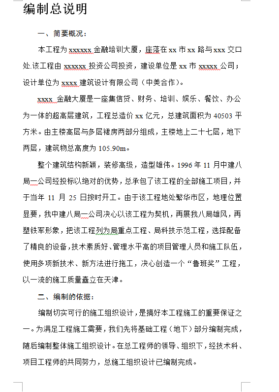 xxxx金融大厦是一座集信贷、财务、培训、娱乐、餐饮、办公为一体的超高层建筑,总建筑面积为40503平方米,由主楼高层与多层裙房两部分组成,主楼地上二十七层,地下两层,地下室建筑面积为7539平方米,地下一层做车库及变电站用,两处坡道式入口通向地下二层,地上部分首层层高为9.6m(其中有6.1m 夹层),二—五层层高3.5m,七层以上标准层3.4m,建筑物总高度为 105.90m。外墙围护结构全部为铝合金墙板与双层中空外镀膜玻璃带组成、进大门部分和局部为玻璃幕墙。内墙面面层有磨光花岗岩、烧毛花岗岩、高级涂料面、柚木板、铝板等,地面采用花岗岩,地面砖、水磨石、抗静电地板、木地板等。