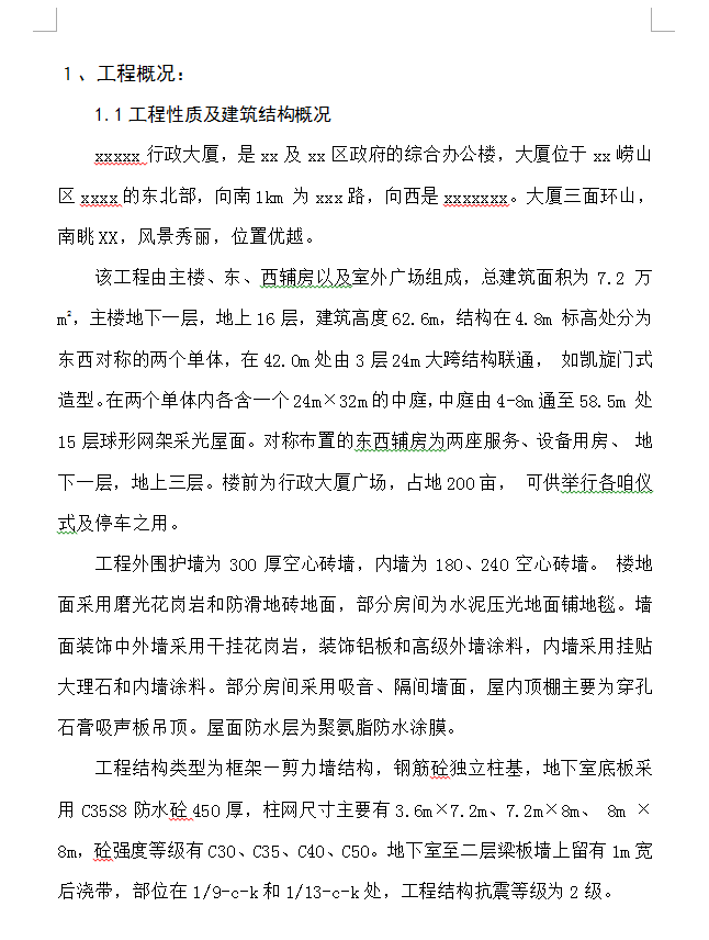 该工程由主楼、东、西辅房以及室外广场组成,总建筑面积为7.2 万m2,主楼地下一层,地上16层,建筑高度62.6m,结构在4.8m 标高处分为东西对称的两个单体,在42.0m处由3层24m大跨结构联通, 如凯旋门式造型。在两个单体内各含一个24m×32m的中庭,中庭由4-8m通至58.5m 处15层球形网架采光屋面。对称布置的东西辅房为两座服务、设备用房、 地下一层,地上三层。楼前为行政大厦广场,占地200亩, 可供举行各咱仪式及停车之用。