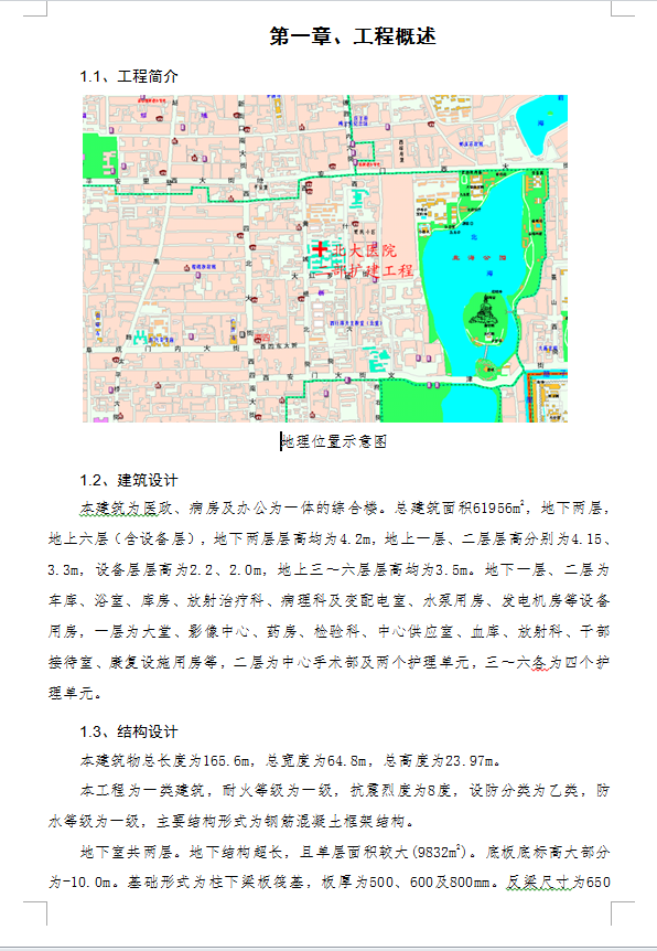 本建筑为医政、病房及办公为一体的综合楼。总建筑面积61956m2,地下两层,地上六层(含设备层),地下两层层高均为4.2m,地上一层、二层层高分别为4.15、3.3m,设备层层高为2.2、2.0m,地上三~六层层高均为3.5m。地下一层、二层为车库、浴室、库房、放射治疗科、病理科及变配电室、水泵用房、发电机房等设备用房,一层为大堂、影像中心、药房、检验科、中心供应室、血库、放射科、干部接待室、康复设施用房等,二层为中心手术部及两个护理单元,三~六各为四个护理单元。