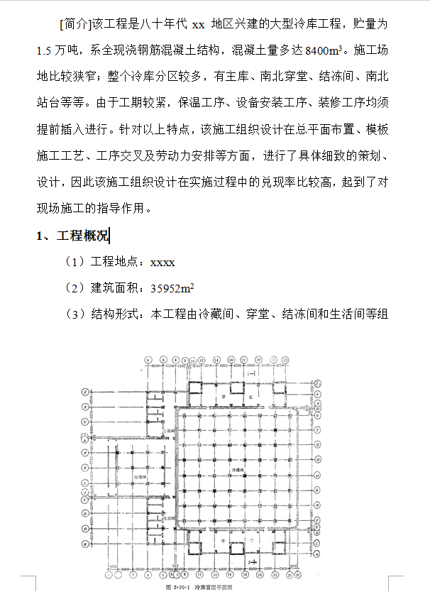 建筑面积:35952m2,结构形式:本工程由冷藏间、穿堂、结冻间和生活间等组成,主楼为冷藏间(21284m2)和穿堂。冷藏间为8层现浇钢筋混凝土无梁楼盖,柱距600×600,柱截面3层以下为700×700,3层以上为600×600,板厚200,柱帽上口尺寸为2600×2600,层高4800,顶部有一层高为3700架空层。370砖墙围护,并在首层地面,架空层及外围护结构处设保温层,穿堂为现浇框架,砖围护,内含电梯井及梯楼。负责冷藏间的垂直、水平运输;层高与冷藏间同。冷藏间与穿堂±0.00以下为钢筋混凝土箱形基础,建筑面积为3114m2,以6000×6000分格,外墙厚360,内墙300,底板厚600,顶板为密肋梁板,总高280。 结冻间(2786m2)为两层现浇框架、砖墙围护。首层为结冻间,2层为设备层,地面、围护墙保温与冷藏间类似,唯顶板保温采用聚苯板。生活间(2079m2)为3层现浇框架,砖墙围护。生活间与结冻间基础为钢筋混凝土独立基础,基底标高-5.73m。本建筑装修为一般装修,唯外墙涂刷一层白色涂料。