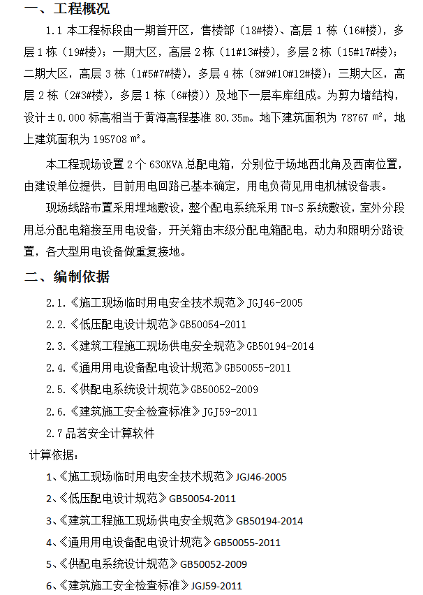 售楼部(18#楼)、高层1栋(16#楼),多层1栋(19#楼);一期大区,高层2栋(11#13#楼),多层2栋(15#17#楼);二期大区,高层3栋(1#5#7#楼),多层4栋(8#9#10#12#楼);三期大区,高层2栋(2#3#楼),多层1栋(6#楼))及地下一层车库组成。为剪力墙结构,设计±0.000标高相当于黄海高程基准80.35m。地下建筑面积为78767㎡,地上建筑面积为195708㎡。