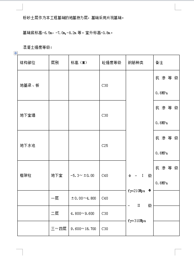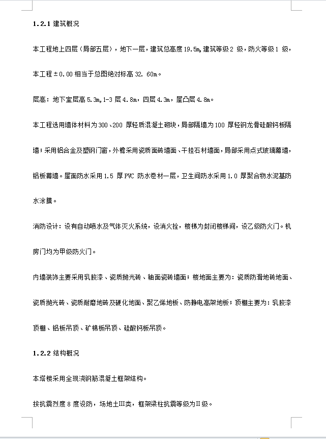 该工程场地面积:7300 m2,总建筑面积:35000m2,地上建筑面积:29300m2,地下室建筑面积:5700 m2。本工程地上四层(局部五层),地下一层,建筑总高度19.5m,建筑等级2 级,防火等级1 级,本工程±0.00 相当于总图绝对标高32. 60m。层高:地下室层高5.3m,1-3 层4.8m,四层4.3m,屋凸层4.8m。本工程选用墙体材料为300、200 厚轻质混凝土砌块,局部隔墙为100 厚轻钢龙骨硅酸钙板隔墙;采用铝合金及塑钢门窗,外檐采用瓷质面砖墙面、干挂石材墙面,局部采用点式玻璃幕墙,铝板幕墙。屋面防水采用1.5 厚PVC 防水卷材一层,卫生间防水采用1.0 厚聚合物水泥基防水涂膜。