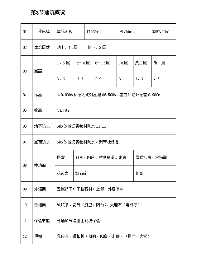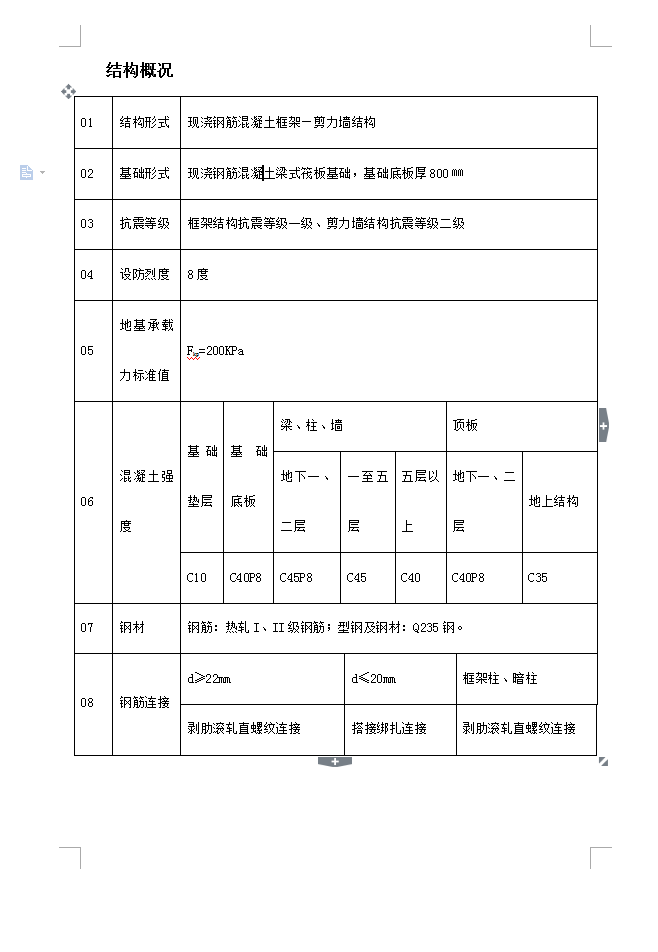 建筑面积:17963m2,占地面积:3392.10m2。地上:14层,地下:2层。±0.000m标高为绝对高程46.500m,室内外地坪高差0.900m。现浇钢筋混凝土框架—剪力墙结构,现浇钢筋混凝土梁式筏板基础,基础底板厚800㎜,框架结构抗震等级一级、剪力墙结构抗震等级二级,设防烈度:8度。