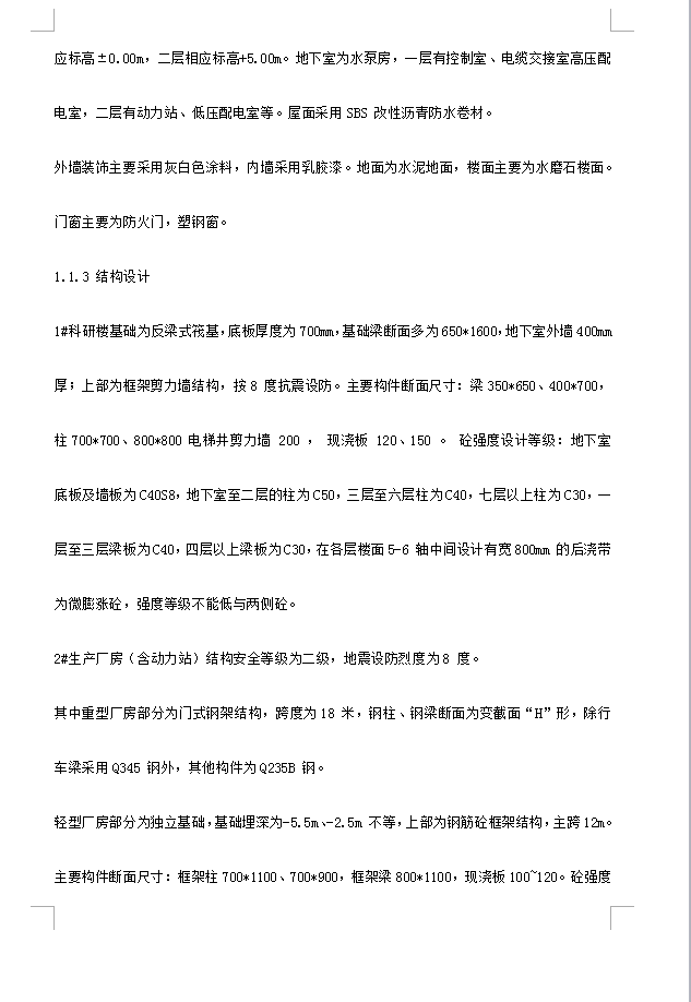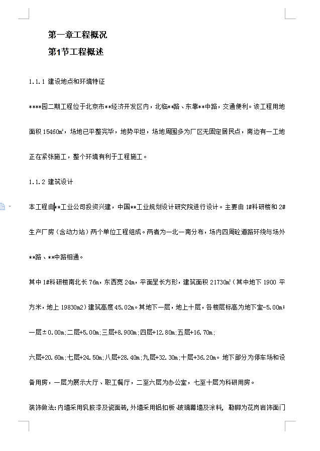 该工程用地面积15460m2,主要由1#科研楼和2#生产厂房(含动力站)两个单位工程组成。两者为一北一南分布,场内四周砼道路环绕与场外**路、**中路相通。其中1#科研楼南北长76m,东西宽24m,平面呈长方形,建筑面积21730m2(其中地下1900 平方米,地上19830m2)建筑高度45.02m。其地下一层,地上十层,各楼层标高为地下室-5.00m;一层±0.00m;二层+5.00m;三层+8.900m;四层+12.80m;五层+16.70m;