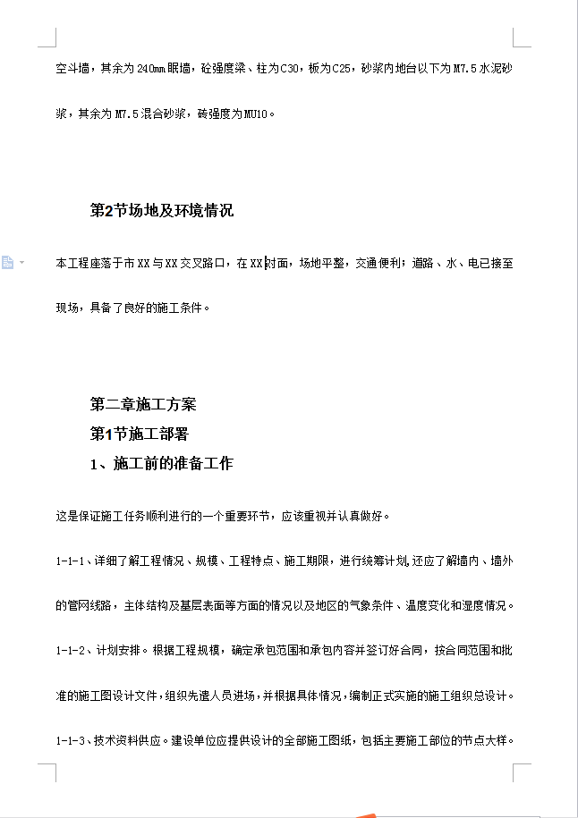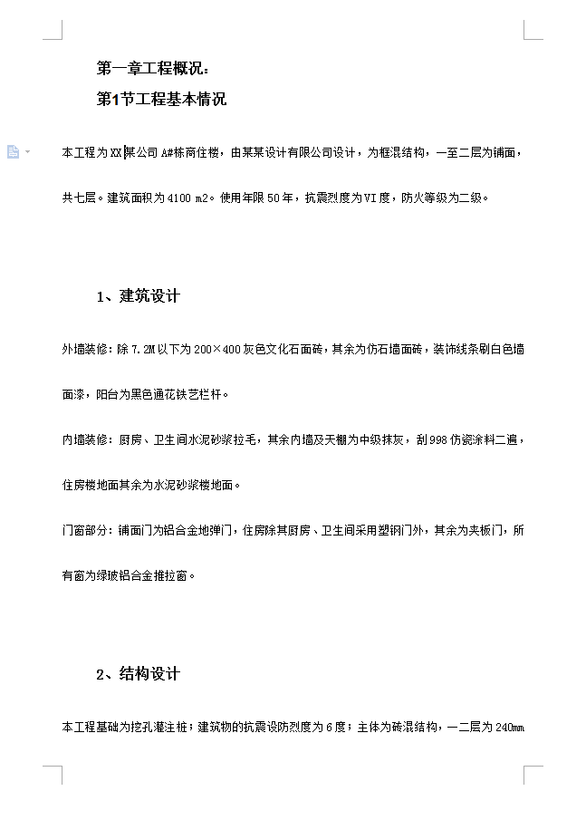本工程基础为挖孔灌注桩;建筑物的抗震设防烈度为6度;主体为砖混结构,一二层为240mm空斗墙,其余为240mm眠墙,砼强度梁、柱为C30,板为C25,砂浆内地台以下为M7.5水泥砂浆,其余为M7.5混合砂浆,砖强度为MU10。,一至二层为铺面,共七层。建筑面积为4100 m2。使用年限50年,抗震烈度为VI度,防火等级为二级。