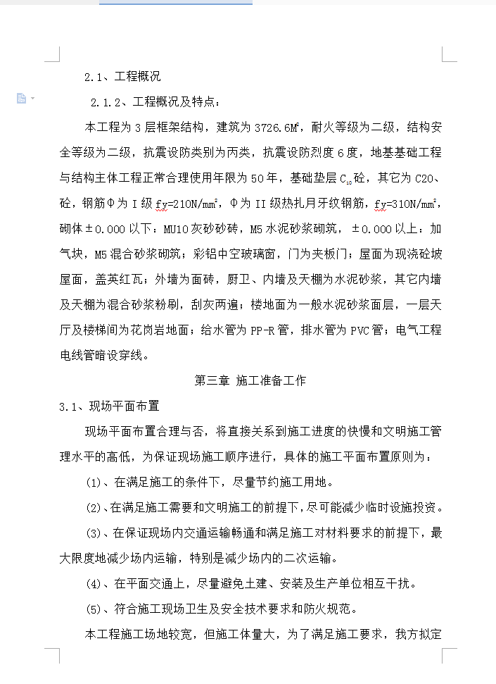 本工程为3层框架结构,建筑为3726.6M2,耐火等级为二级,结构安全等级为二级,抗震设防类别为丙类,抗震设防烈度6度,地基基础工程与结构主体工程正常合理使用年限为50年,基础垫层C10砼,其它为C20、砼,钢筋φ为I级fy=210N/mm2,φ为II级热扎月牙纹钢筋,fy=310N/mm2,砌体±0.000以下:MU10灰砂砂砖,M5水泥砂浆砌筑,±0.000以上:加气块,M5混合砂浆砌筑;彩铝中空玻璃窗,门为夹板门;屋面为现浇砼坡屋面,盖英红瓦;外墙为面砖,厨卫、内墙及天棚为水泥砂浆,其它内墙及天棚为混合砂浆粉刷,刮灰两遍;楼地面为一般水泥砂浆面层,一层天厅及楼梯间为花岗岩地面;给水管为PP-R管,排水管为PVC管;电气工程电线管暗设穿线。