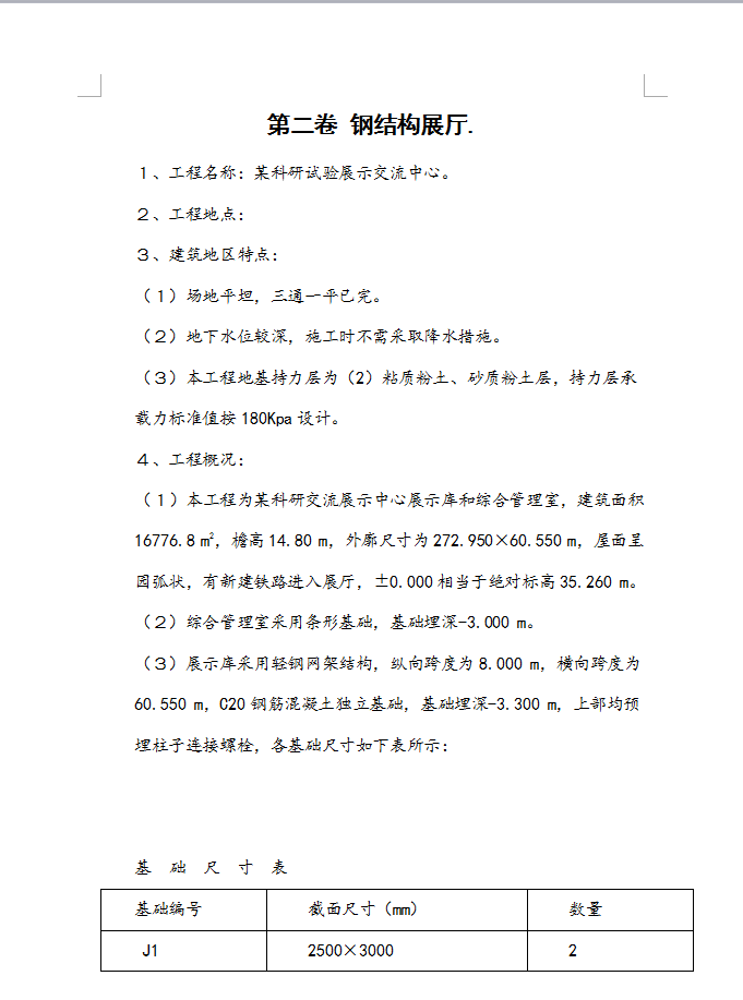 本工程为某科研交流展示中心展示库和综合管理室,建筑面积16776.8 m2,檐高14.80 m,外廓尺寸为272.950×60.550 m,屋面呈园弧状,有新建铁路进入展厅,±0.000相当于绝对标高35.260 m。综合管理室采用条形基础,基础埋深-3.000 m。展示库采用轻钢网架结构,纵向跨度为8.000 m,横向跨度为60.550 m,C20钢筋混凝土独立基础,基础埋深-3.300 m,上部均预埋柱子连接螺栓。