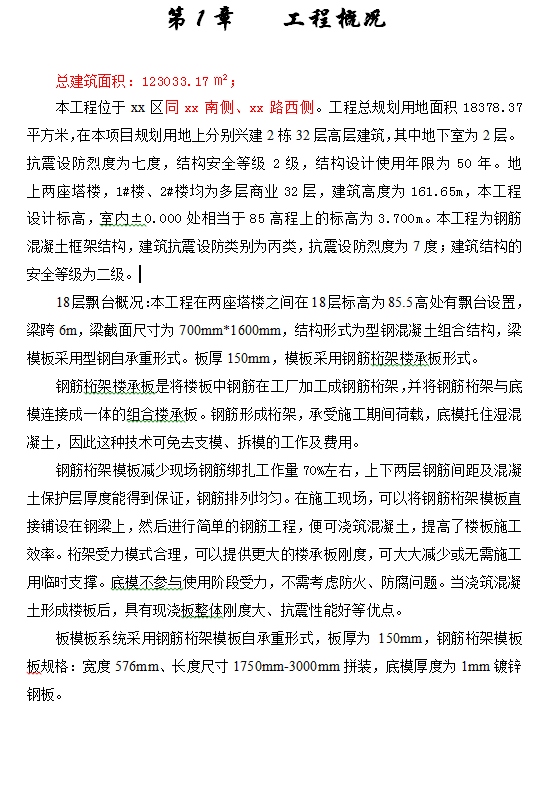 工程总规划用地面积18378.37平方米,在本项目规划用地上分别兴建2栋32层高层建筑,其中地下室为2层。抗震设防烈度为七度,结构安全等级2级,结构设计使用年限为50年。地上两座塔楼,1#楼、2#楼均为多层商业32层,建筑高度为161.65m,本工程设计标高,室内±0.000处相当于85高程上的标高为3.700m。本工程为钢筋混凝土框架结构,建筑抗震设防类别为丙类,抗震设防烈度为7度;建筑结构的安全等级为二级。