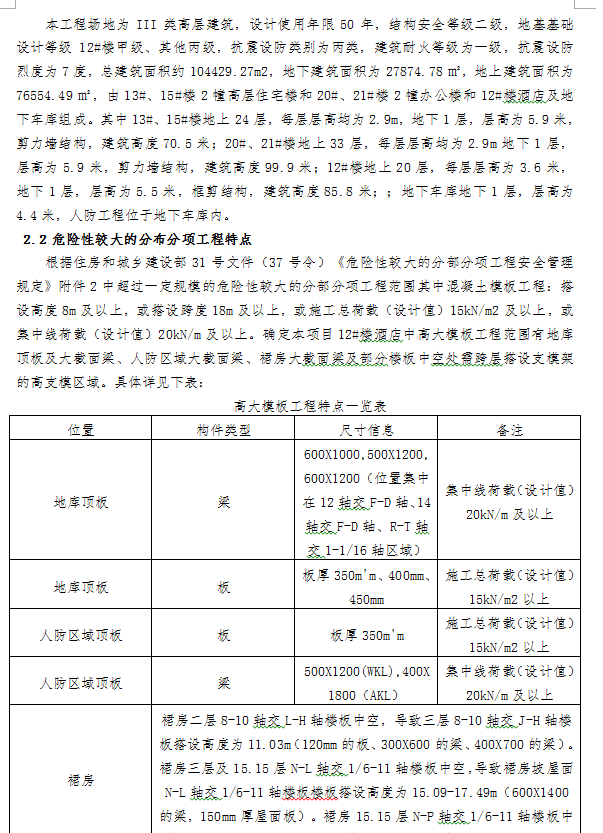 本工程场地为III类高层建筑,设计使用年限50年,结构安全等级二级,地基基础设计等级12#楼甲级、其他丙级,抗震设防类别为丙类,建筑耐火等级为一级,抗震设防烈度为7度,总建筑面积约104429.27m2,地下建筑面积为27874.78㎡,地上建筑面积为76554.49㎡,由13#、15#楼2幢高层住宅楼和20#、21#楼2幢办公楼和12#楼酒店及地下车库组成。其中13#、15#楼地上24层,每层层高均为2.9m,地下1层,层高为5.9米,剪力墙结构,建筑高度70.5米;20#、21#楼地上33层,每层层高均为2.9m地下1层,层高为5.9米,剪力墙结构,建筑高度99.9米;12#楼地上20层,每层层高为3.6米,地下1层,层高为5.5米,框剪结构,建筑高度85.8米;;地下车库地下1层,层高为4.4米,人防工程位于地下车库内。