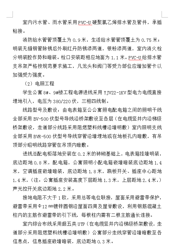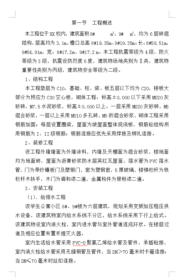 建筑面积8# m2,9# m2,均为6层砖混结构,层高均为3.1m,檐口总高8#19.35m、9#19.35m;长:8#58.51m,9#54.91m,宽:8#17.2m、9#17.2 m。本工程抗震等级为4级,防火等级为3级,抗震设防烈度6度,建筑物场地类别为Ⅱ类,建筑物重要性类别为丙级,建筑物安全等级为二级。本工程垫层为C10,基础、柱、梁、板五层以下均为C20,楼板大部分为预应力C30空心板,砌体工程:标高±0.000以下采用MU20灰砂砖,M7.5水泥砂浆,标高±0.000以上:一层采用MU20灰砂砖,M5混合砂浆,一层以上采用MU10多孔砖,M5的混合砂浆,砌体工程采用钢筋加固;每层设置圈梁,屋面为坡屋面整体现浇板,钢筋砼结构所用钢筋为I、II级钢筋;钢筋连接应优先采用焊接及绑扎连接。