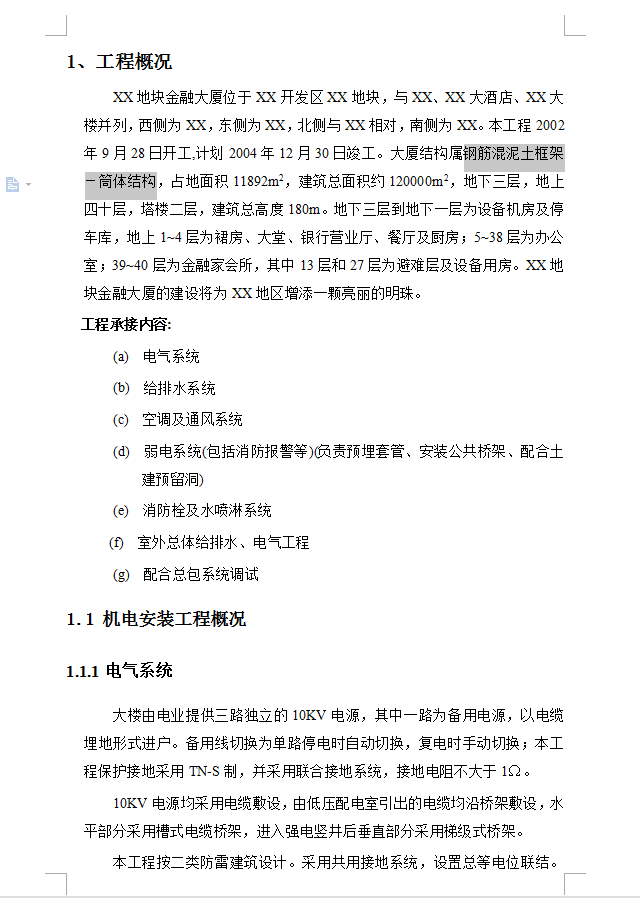 XX地块金融大厦位于XX开发区XX地块,与XX、XX大酒店、XX大楼并列,西侧为XX,东侧为XX,北侧与XX相对,南侧为XX。本工程2002年9月28日开工,计划2004年12月30日竣工。大厦结构属钢筋混泥土框架-筒体结构,占地面积11892m2,建筑总面积约120000m2,地下三层,地上四十层,塔楼二层,建筑总高度180m。地下三层到地下一层为设备机房及停车库,地上1~4层为裙房、大堂、银行营业厅、餐厅及厨房;5~38层为办公室;39~40层为金融家会所,其中13层和27层为避难层及设备用房。XX地块金融大厦的建设将为XX地区增添一颗亮丽的明珠。