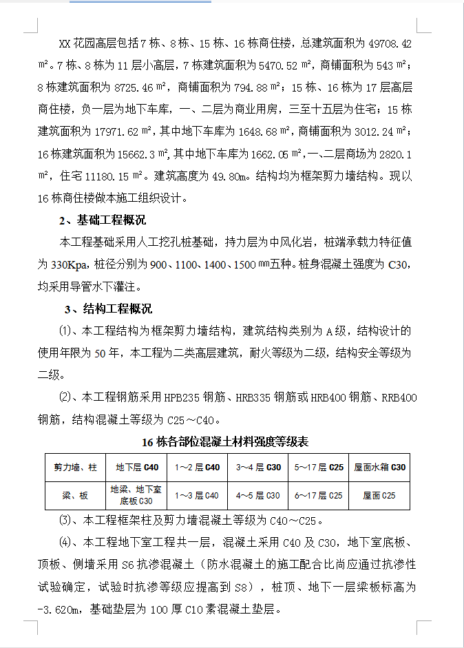 建筑面积为15662.3㎡,其中地下车库为1662.05㎡,一、二层商场为2820.1㎡,住宅11180.15㎡。建筑高度为49.80m,结构均为框架剪力墙结构。本工程基础采用人工挖孔桩基础,持力层为中风化岩,桩端承载力特征值为330Kpa,桩径分别为900、1100、1400、1500㎜五种。桩身混凝土强度为C30,均采用导管水下灌注。