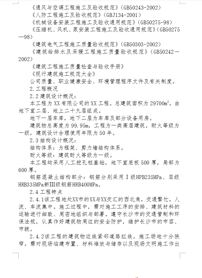 本工程为XX有限公司的XX工程,总建筑面积为29700m2。由地下室二层、地上二十九层组成。地下一层车库,地下二层为车库及部分设备用房。建筑物总高度为99.95m,工程为一类高层建筑,耐火等级为一级,建筑设计合理使用年限为50年。结构体系:为框架、剪力墙结构体系。耐火等级:建筑耐火等级为一级。本工程均采用人工挖孔桩基础,地下室底板500厚,局部为600厚。